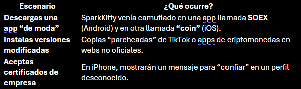 Instalas versiones modificadas | Copias “parcheadas” de TikTok o apps de criptomonedas en webs no oficiales. |