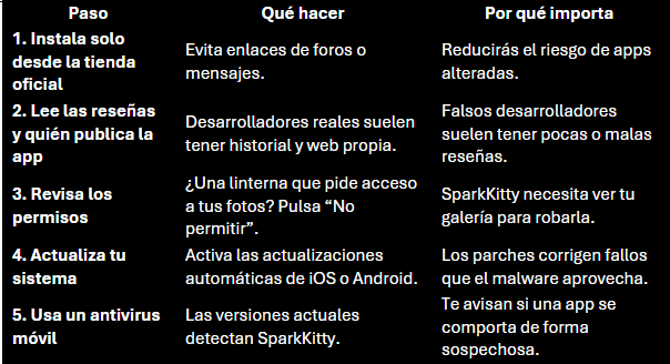 SparkKitty nos recuerda que la seguridad móvil no es solo cosa de “expertos”. Con unos hábitos sencillos—descargar de fuentes confiables, revisar permisos y mantener el teléfono al día—puedes mantener tus fotos y tu dinero a salvo.
